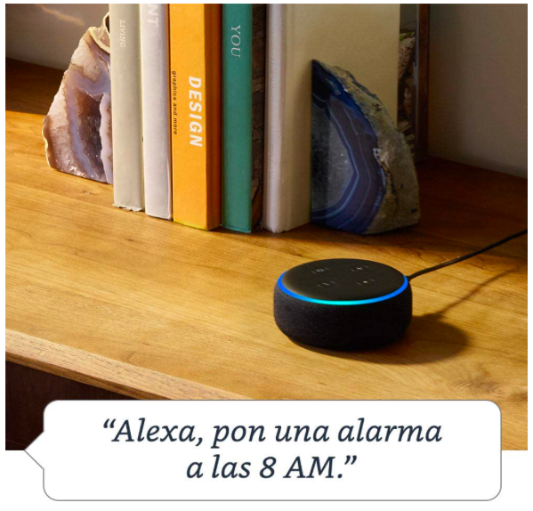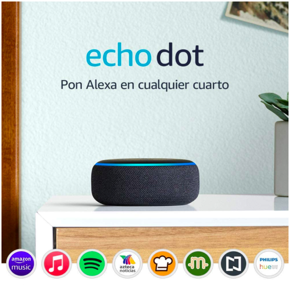 - Nuestra bocina más popular – Echo Dot es una bocina inteligente que se controla con la voz y te conecta con Alexa a través de red Wi-Fi.
